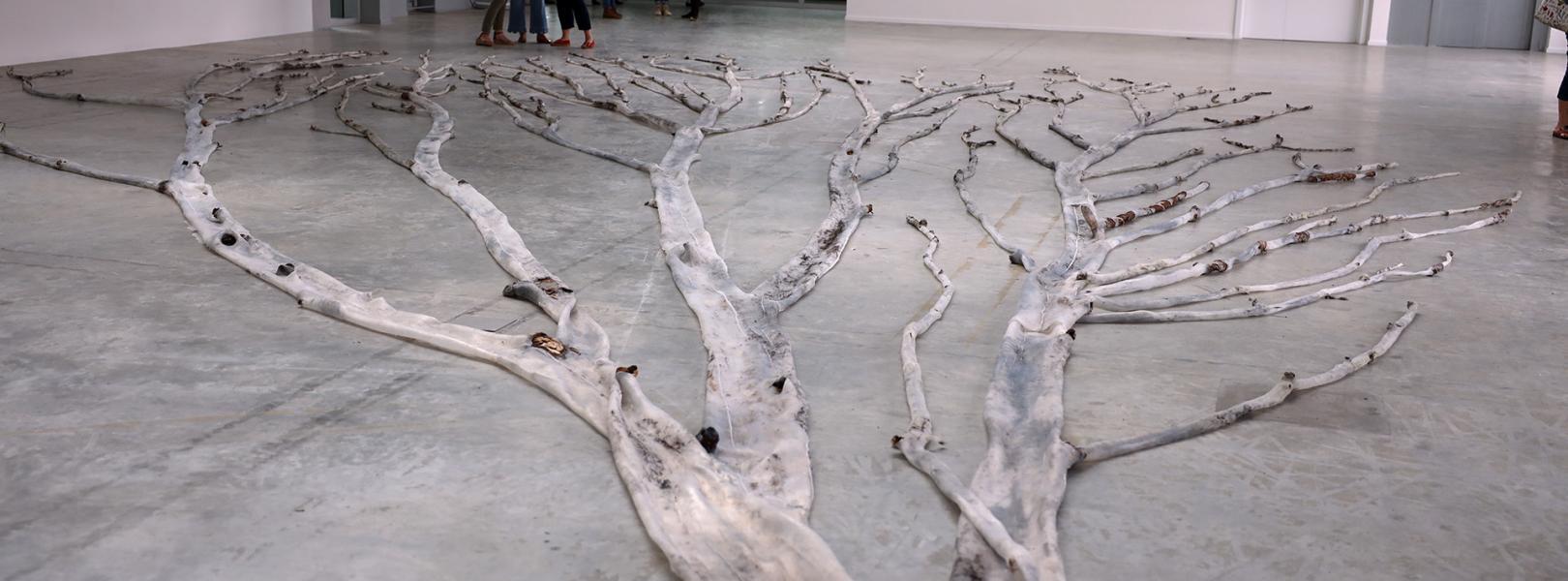 Dans l’espace complètement ouvert de la Kunsthalle, se déploie sur le sol le squelette d’un grand arbre à la forme reconstituée en silicone. Ses ramifications, telles des tentacules avachies occupe tout le territoire central de l’exposition et renvoie dès lors le visiteur vers les accrochages aux murs de la salle.