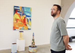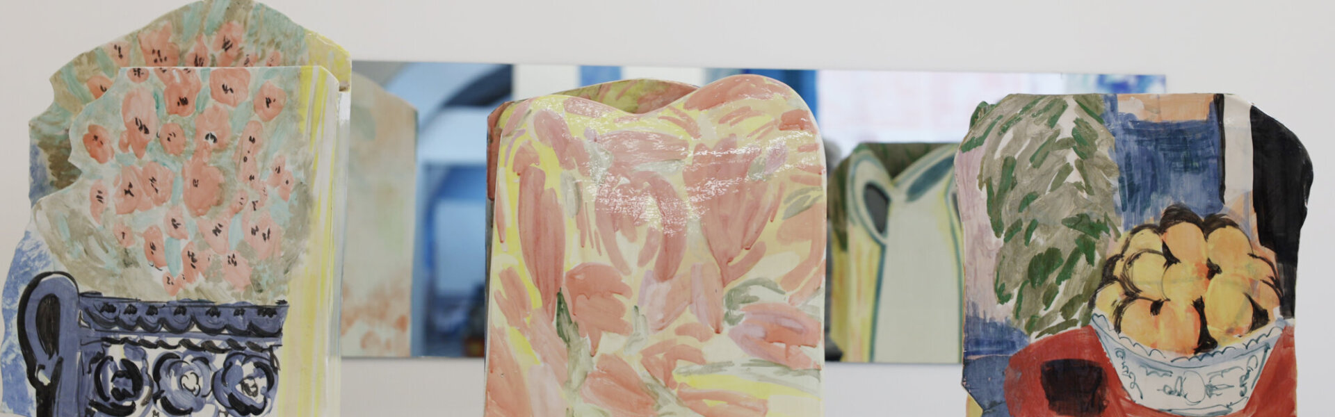 L’artiste strasbourgeois François Bauer, lui, utilise la céramique comme une forme pour valoriser la couleur, au-delà de sa valeur d’usage, quite à déborder de l’objet pour se prolonger sous forme de peinture ou de papier peint.