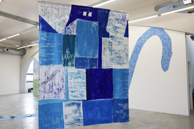 Dès le premier espace qui revendique le fait de « ‘prendre de la hauteur », le ton est donné. Alors que François Bauer suggère le prolongement de l’architecture du lieu sous forme de colonne introductive, un parterre de gros « poufs » invite le visiteur à s’asseoir pour juste apprécier la grande tenture peinte de Christiane Fath ou s’évader dans une autre toile évoquant la Méditerranée.