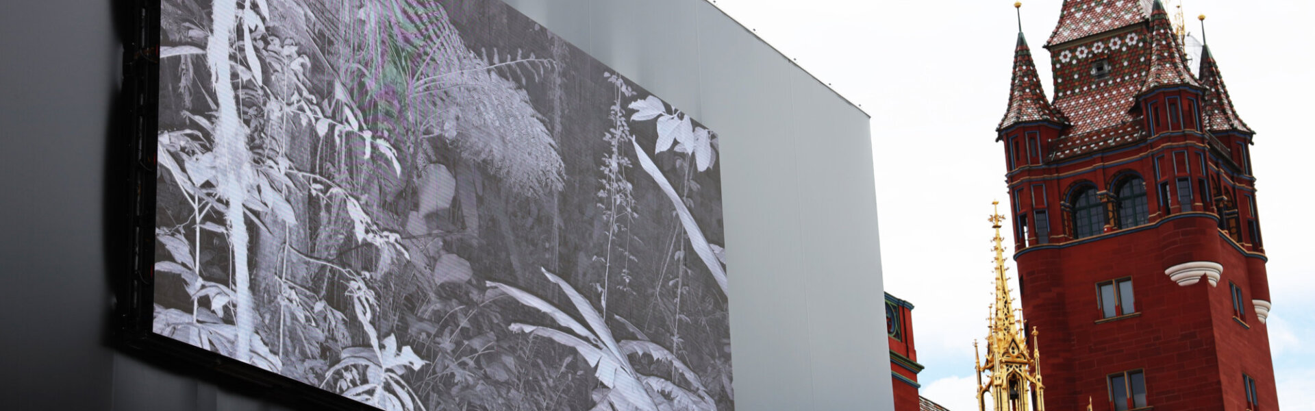 Installation multimédia « Calls for Action » de l’artiste franco-suisse Julian Charrière dans le cadre de l’événement Globus Art Project présenté par la Fondation Beyeler sur les façades du chantier de rénovation du magasin Globus de Bâle