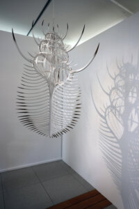 De ce rapprochement dangereux Suhail Shiakh a fait une écriture qui se décline dans cette grande forme sphérique de papier découpé et assemblé, suspendue au-dessus d’un bassin d’eau où elle se reflète, et intitulée La délicate légèreté de l’être.