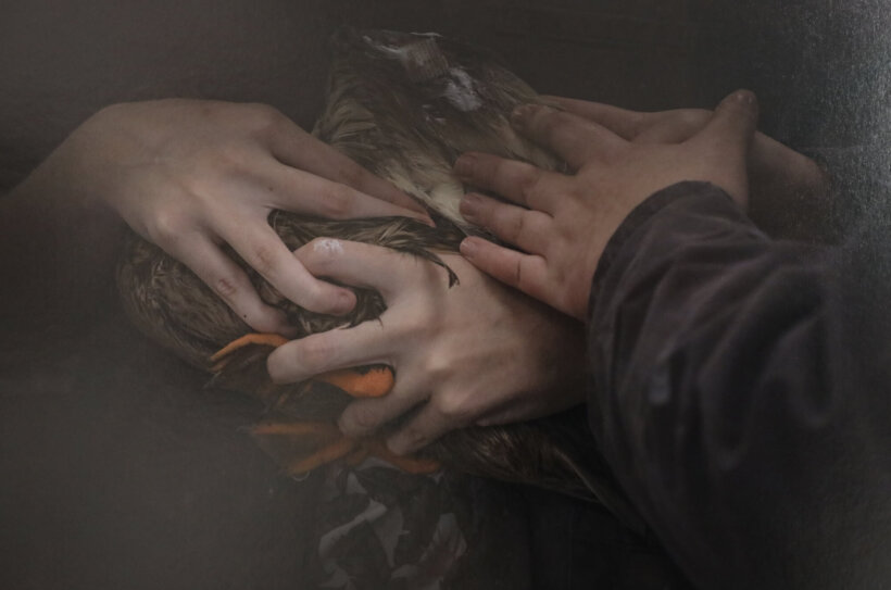 Des mains qui enserrent un oiseau blessé, le regard d’une chouette qui transperce la pénombre, un vol de martinet… les photographies d’Aurélie Scouarnec issues d’une série intitulée Ferae disent cette relation de l’humain à l’animal telles qu’elles les a captées dans des centres de soins pour la faune sauvage. « Je voulais m’approcher des gestuelles » des soigneurs, explique-t-elle, « être le plus proche de leurs sensations ».