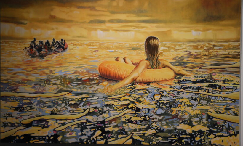 Une interrogation que suscite aussi cet autre personnage – toujours peint de dos – assis dans une bouée dont le regard pointe vers un groupe humain dans une embarcation de fortune, canot pneumatique emblématique des traversées de migrants tentant de rejoindre une terre promis