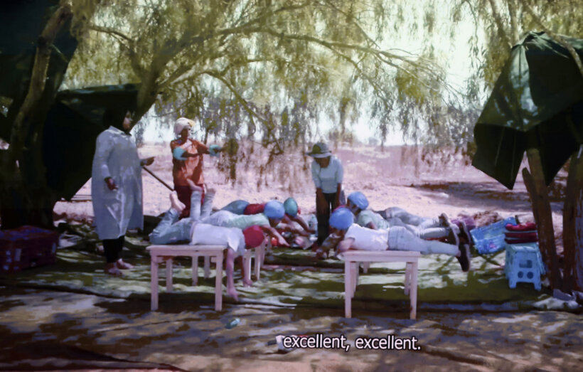 Si les Bédouins montrés dans cette vidéo apprennent à nager… sans eau, c’est tout simplement parce qu’ils n’ont pas accès à des piscines normales et que ne sachant nager sont exposés à des noyades en mer. C’est aussi le manque d’eau, renforcé par le réchauffement climatique, qui se signale dans cette oeuvre en forme de para ole.