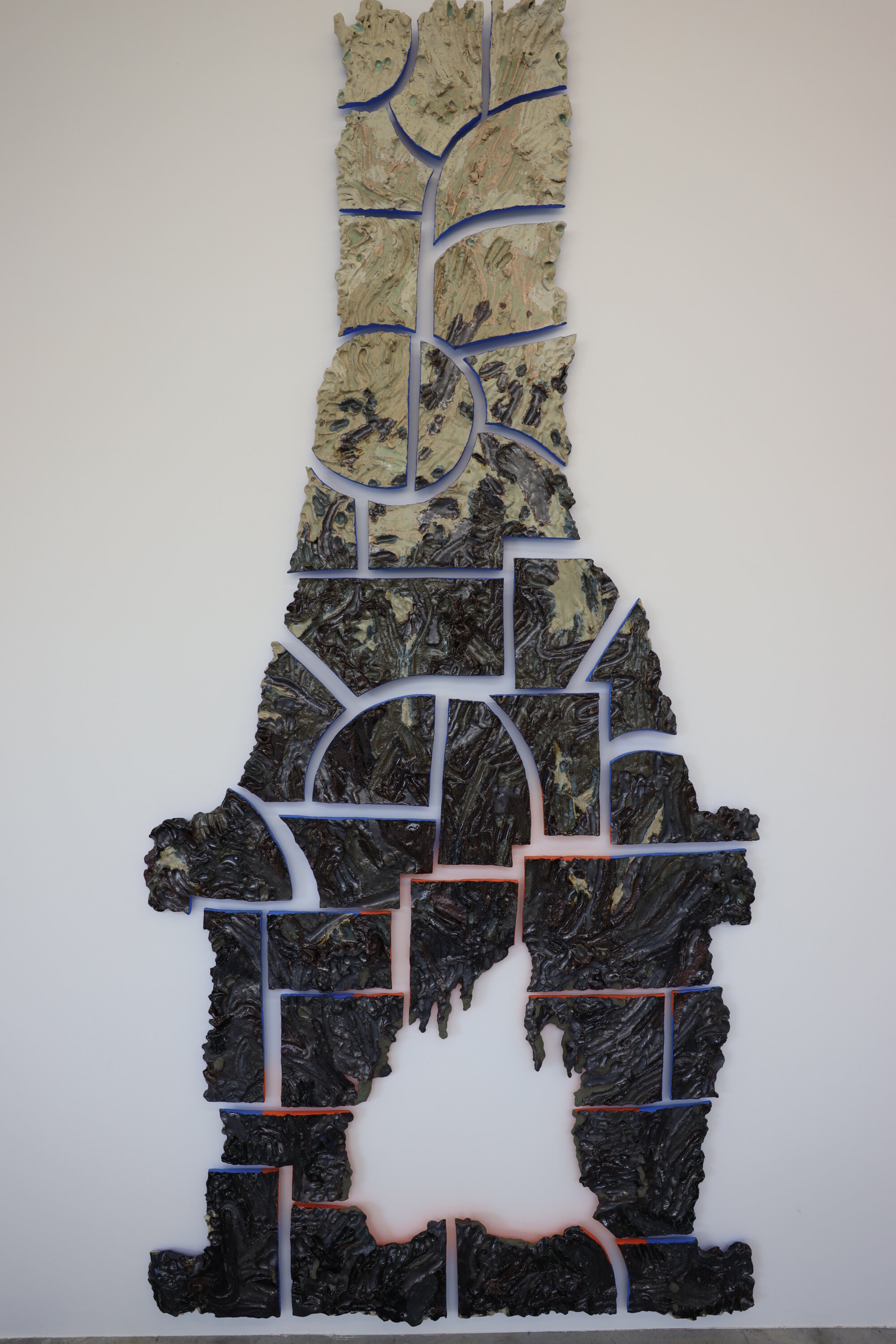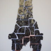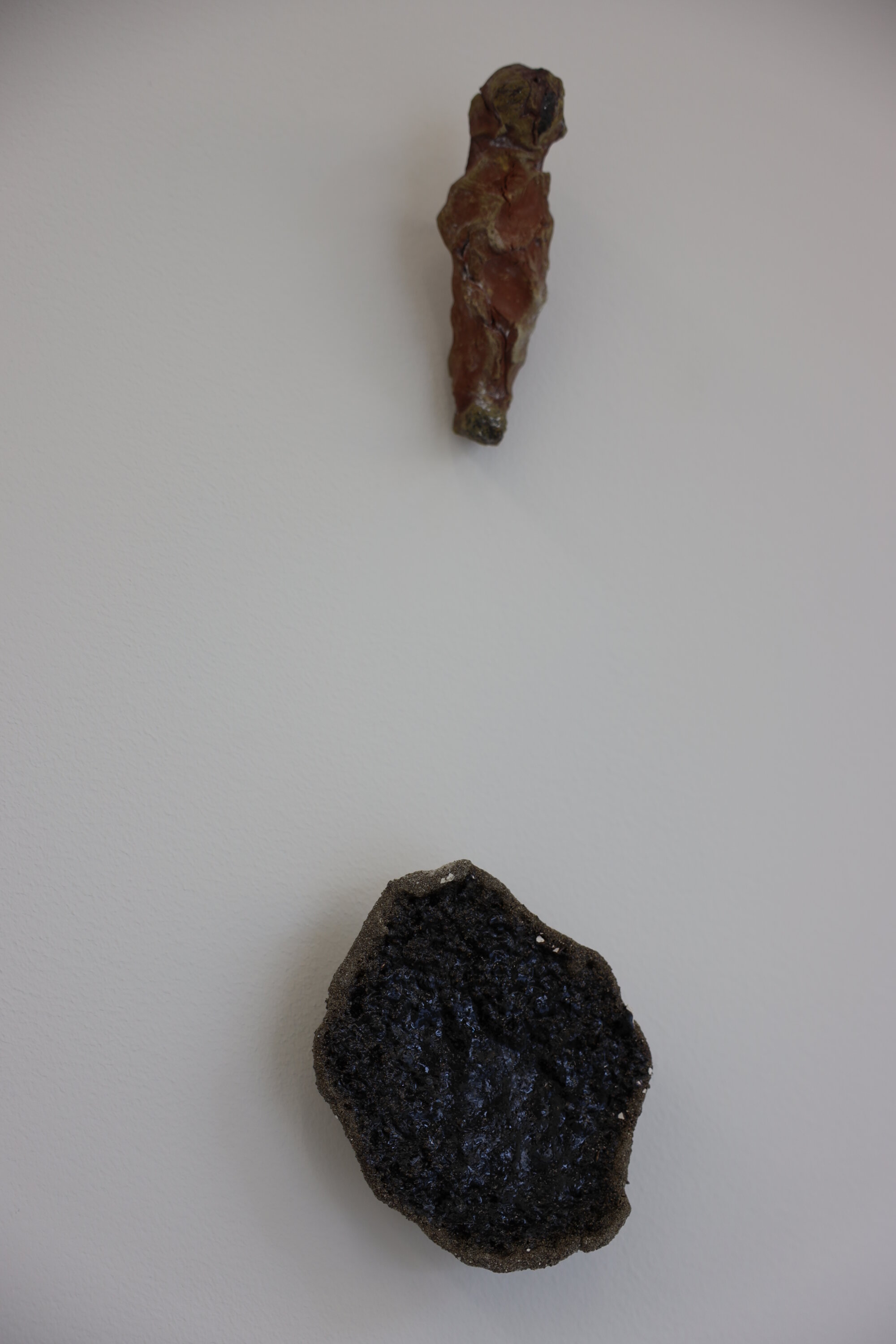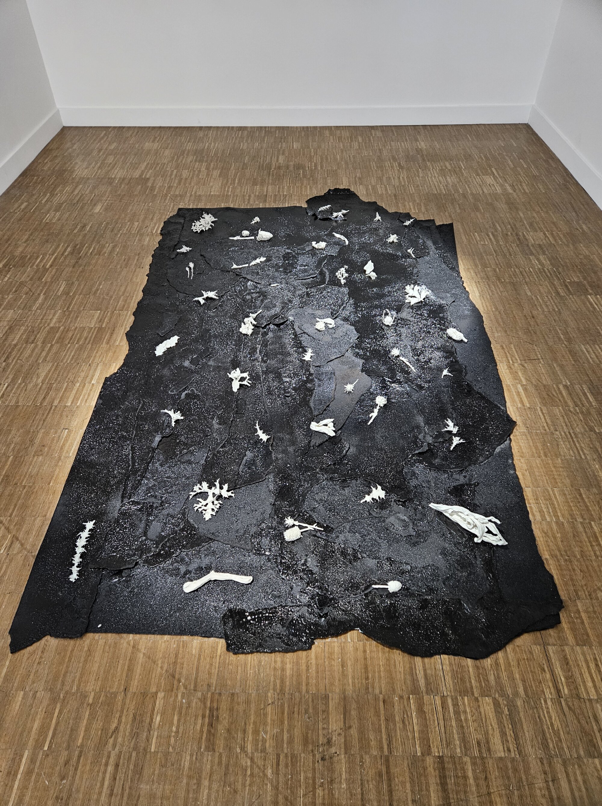 A la Kuntshalle, Elise Planhard compose un tapis de briques fabriquées avec les résidus de cuissons de ses émaux. Cette matière récupérée révèle des textures et des couleurs qui s’apparente à des strates géologiques.