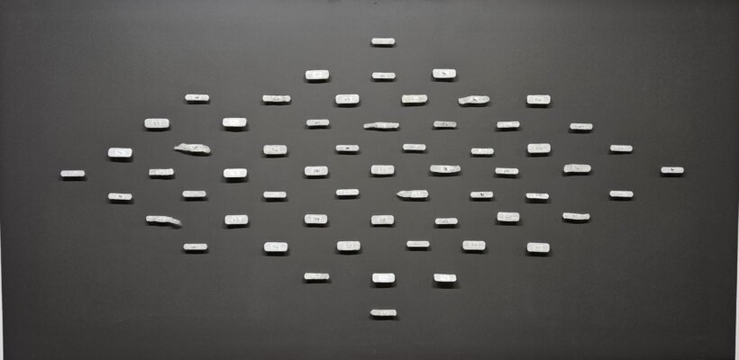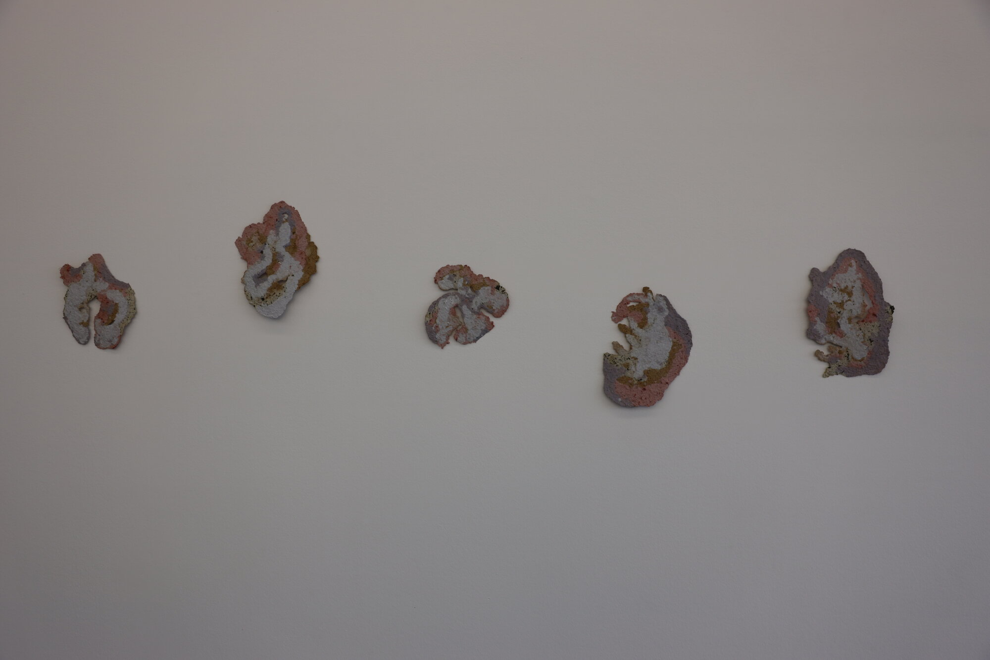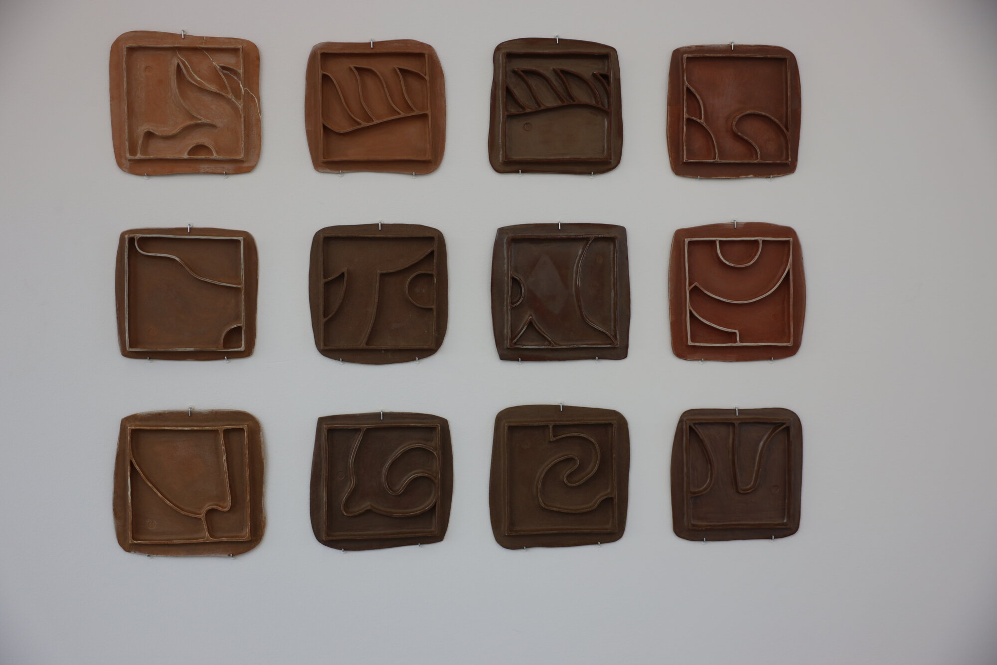 A la Kuntshalle, Elise Planhard compose un tapis de briques fabriquées avec les résidus de cuissons de ses émaux. Cette matière récupérée révèle des textures et des couleurs qui s’apparente à des strates géologiques.