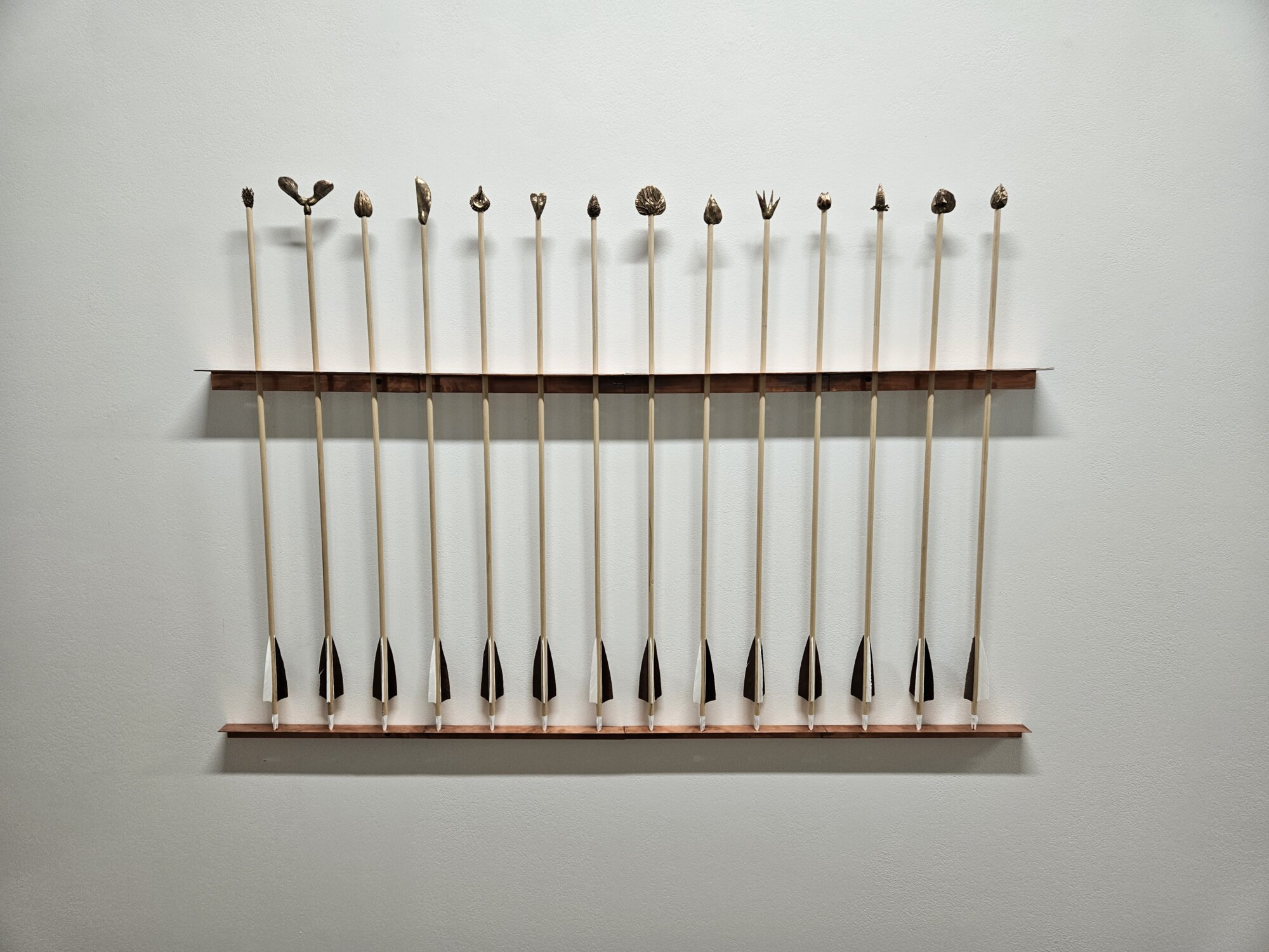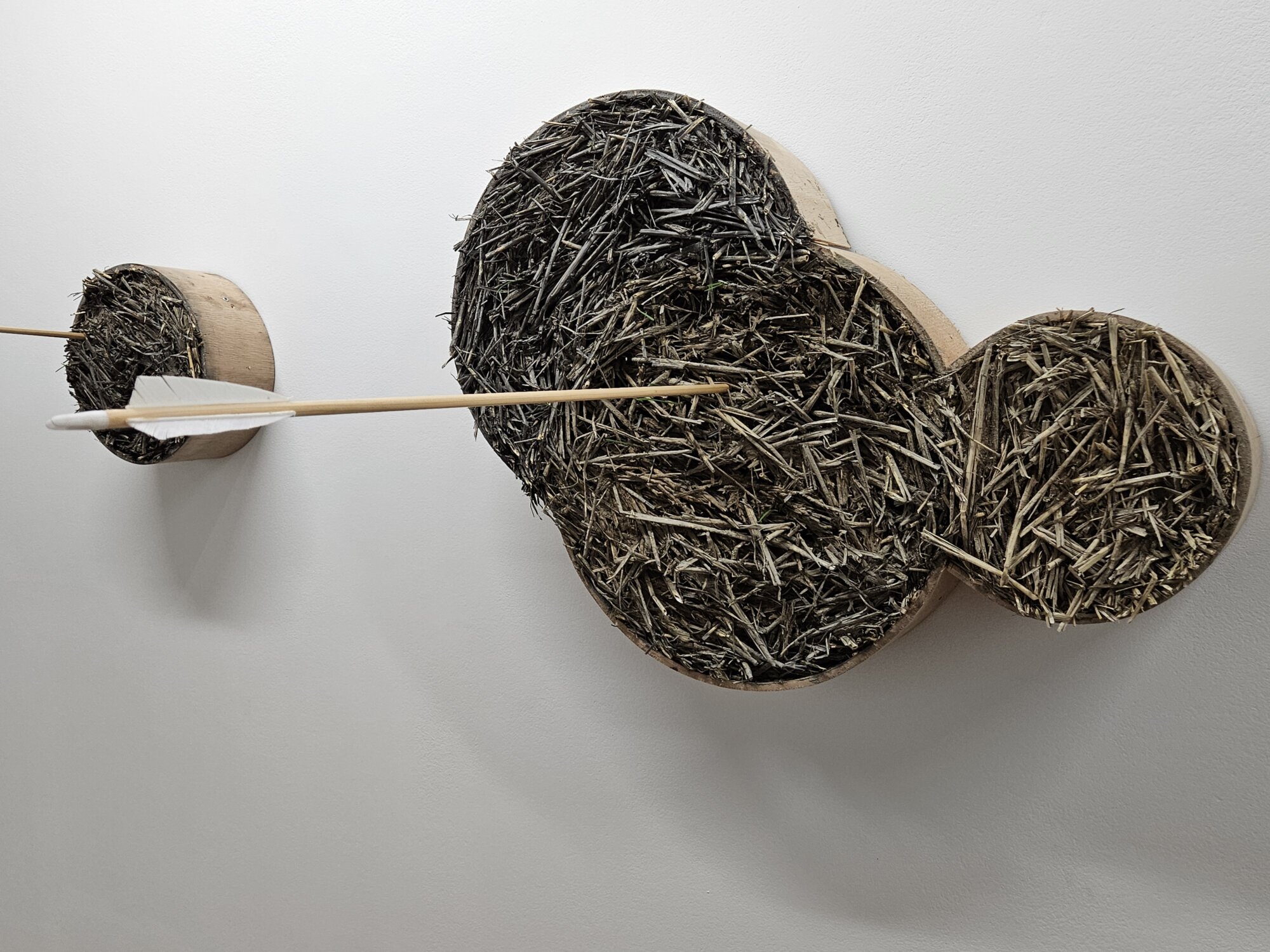 Elle imagine encore des flèches aux pointes de bronze figurant toutes sortes de graines qui viennent se ficher dans une cible végétale, terreau d’une regénération possible.
