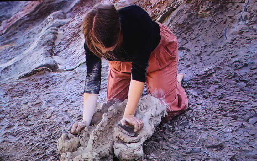C’est aussi dans un geste ancestral de malaxation d’un bloc d’argile que l’artiste suggère de manière plus performative l’engagement du corps confronté à la matière.
