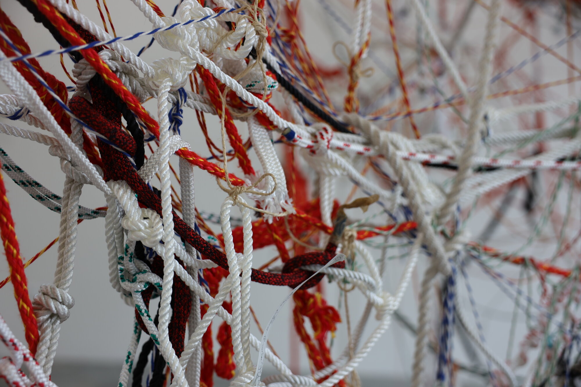 Eddie de Goër tisse une toile de cordes qui installe un système relation et d’interaction sous chaque tension qu’on y applique. Métaphore d’un tissu social qui se tend, se distend, se noue, s’entrecroise…